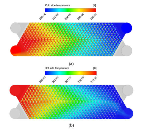 The channel of the plate heat exchanger consists of a distribution part, a heat exchange part, and a merging part, and the difference in velocity distribution of each channel in the distribution part affects the local heat transfer performance and causes thermal non-uniformity. Figure 5 shows the temperature distribution at the cold and hot side channels. The temperature distribution of the plate heat exchanger shows symmetry at the center of the channel. Both the cold and hot side channels have a symmetrical temperature distribution in the middle of the channel. However, it can be confirmed that the temperature distribution is non-uniform near the inlet and outlet ports. The channel of the cold side had a low temperature near the inlet port at the same flow direction length but had a relatively high temperature near the outlet port of the hot side channel. However, the temperature distribution was eccentric near the outlet ports of the cold and hot sides owing to the different velocity distribution at the channel.