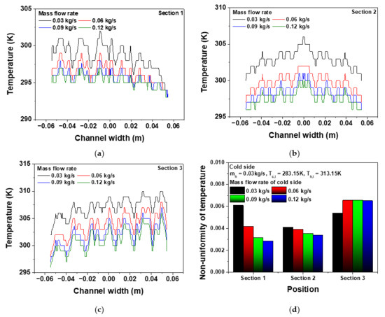 Figure 6 shows the temperature distribution and non-uniformity by channel location on the widthwise wall of the plate heat exchanger. In Section 1, it was confirmed that the temperature distribution appeared to be low in the positive direction with the inlet port of the cold side but high in the negative direction adjacent to the outlet port of the hot side. On the other hand, Section 2, which is the middle of the channel, shows a high temperature at the center of the channel, and it can be seen that the temperature distribution shows left-right symmetry. Moreover, in Section 3, it was confirmed that the temperature distribution was formed low in the negative direction where the outlet port of the cold side is located. In contrast, the high temperature in the positive direction is adjacent to the inlet temperature of the hot side. The temperature non-uniformity in Sections 1 and 2 of the channels of the cold side decreased to 0.0061–0.0028 and 0.0041–0.0034 as the mass flow rate of the cold side increased from 0.03 kg/s to 0.12 kg/s, whereas the temperature non-uniformity in Section 3 was instead increased to 0.0054–0.0064. These results imply that the temperature non-uniformity of the channel wall is closely related to the flow velocity distribution due to the geometrical characteristics of the plate heat exchanger. The local maldistribution of the flow velocity can improve the local heat transfer in a channel with high heat capacity. However, it is difficult to effectively transfer heat because the heat capacity at a specific location increases, and the temperature distribution is non-uniform.