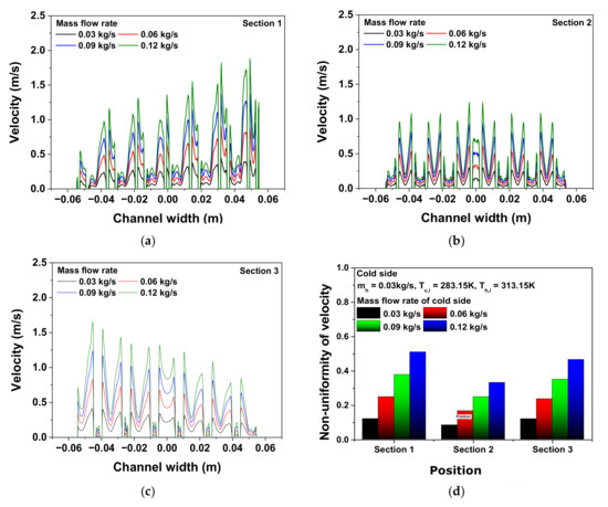 Velocity and cold side at each position: (a) Section 1, (b) Section 2, (c) Section 3, and (d) non-uniformity of velocity.