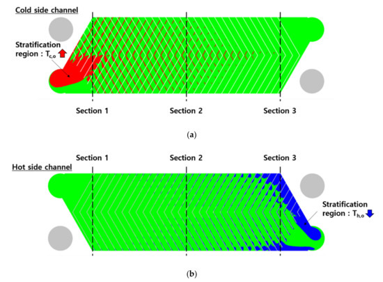 Figure 8 shows the superheating region of the cold side channel and the subcooling region of the hot side channel. When the mass flow rates on the hot and cold sides are 0.03 kg/s and 0.09 kg/s, the inlet temperatures of the hot and cold sides are 293.15 K and 313.15 K. In the cold side channel, the area overheated above the outlet temperature was located in the center of the merging section. The area overheated than the outlet temperature in the hot side channel was located outside the converging section. This phenomenon is due to the non-uniformity of the flow velocity distribution locally in the plate heat exchanger channel. When the fluid flows from the merging part to the outlet port, the fluid does not mix and causes a stratified flow. Therefore, this phenomenon can be expressed as a part of the flow or thermal stratification, and in this study, it was defined as a stratification phenomenon. The stratification phenomenon in the channel is due to the non-uniformity of the flow velocity at the merge. The channel of the cold side has a relatively high heat transfer coefficient at a relatively high flow rate in the center of the distribution part and a low heat transfer coefficient in the side part. In addition, the local heat capacity is unbalanced due to the maldistribution of the mass flow rate. Although the heat transfer coefficient is locally increased due to the concentration of the flow rate, the heat capacity also increases. Therefore, the temperature at the point where the flow velocity is slow changes more rapidly. Thermal stratification occurs by this mechanism due to the non-uniform flow velocity at the distribution and merging section of each channel in the plate heat exchanger.