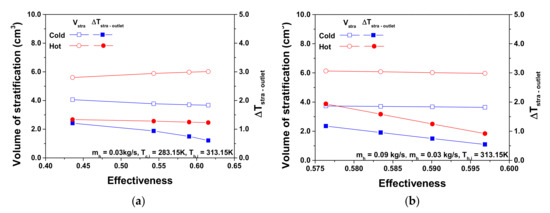 The volume of stratification and ΔT_(stra-outlet): (a) according to the mass flow rate of the cold side, (b) according to the inlet temperature of the cold side.