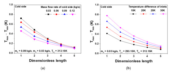 Maximum and minimum temperature difference according to a dimensionless length: (a) according to the mass flow rate of the cold side, (b) according to the inlet temperature.