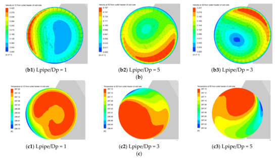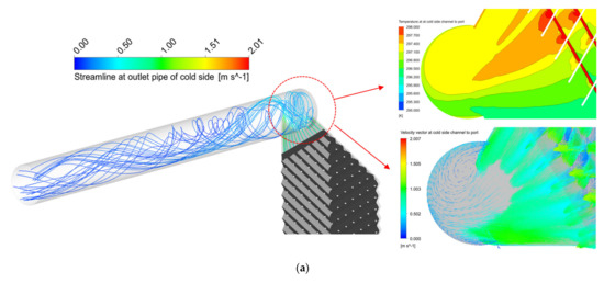 Temperature and velocity distribution image at outlet port and pipe: (a) Streamline at the outlet port of cold side and temperature contour and velocity vector at the outlet port; (b) velocity contour and vector at the outlet pipe of the cold side; (c) temperature contour at the outlet pipe of the cold side.