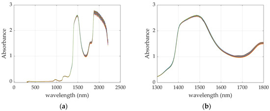 Absorbance spectra of propionic acid concentration between 0 and 5.66% m/m; (a) in the full range of wavelengths; (b) in the wavelength range limited to 1300–1800 nm.