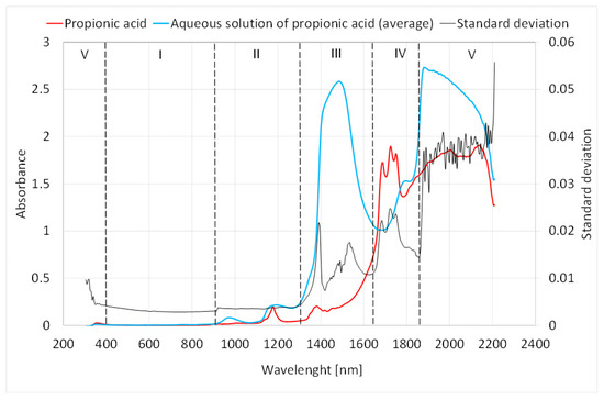 Figure 3 presents the absorbance spectra of the following: propionic acid, aqueous solution (average value for 60 samples with increasing concentration of propionic acid) and standard deviation from the average. Pure propionic acid has the highest absorbance in zone IV; therefore, it is expected that, also in this range, the absorbance graphs for all concentrations of aqueous propionic acid solutions should show the greatest sensitivity.