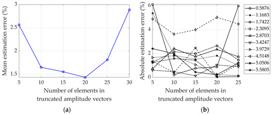 Estimation error generated by a model trained by input data truncated to 5, 10, 15, 20, 25 and 30 amplitudes in the full range of wavelengths of absorbance spectra; (a) mean estimation error; (b) absolute estimation error for different concentration levels of propionic acid.