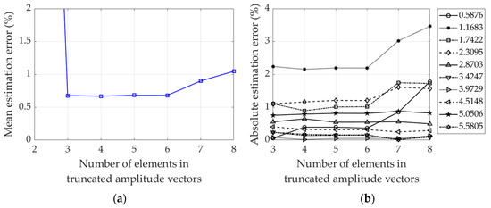 Estimation error generated by a model trained by input data truncated to 2, 3, 4, 5, 6, 7 and 8 amplitudes in the wavelength range truncated to 1300–1800 nm; (a) mean estimation error; (b) absolute estimation error for different concentration levels of propionic acid.