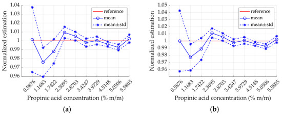 It is clearly visible that in both models (Figure 6) the standard deviation is much higher for lower values of propionic acid concentrations. Furthermore, the normalized error is higher for acid concentrations below 2%, which indicates a greater level of noise in these concentration ranges.