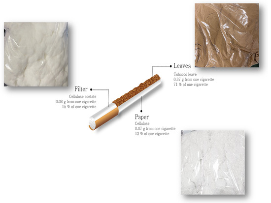 - D’heni Teixeira, M.B.; Duarte, M.A.B.; Raposo Garcez, L.; Camargo Rubim, J.; Hofmann Gatti, T.; Suarez, P.A.Z. Process development for cigarette butts recycling into cellulose pulp. Waste Manag. 2017, 60, 140–150. [Google Scholar] [CrossRef]