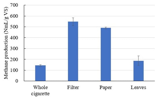 To understand AD with intact cigarettes, experimental data were applied for the modified Gompertz model (see Supplementary Materials, Figure S4, for details). The methane production potential of intact cigarettes was found to be 152.4 mL/TS. The highest methane production potential of 443.0 mL/g TS was observed for the filter compartment of cigarettes. The filter of the cigarette is the part that is leftover in the highest quantity after smoking, and it contributes the most to the production of methane from CBs.