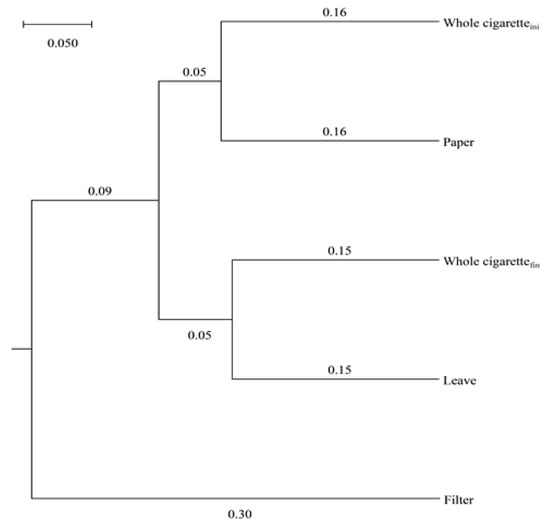 UPGMA clustering of bacterial microbes fed intact cigarettes or individual components for anaerobic digestion.