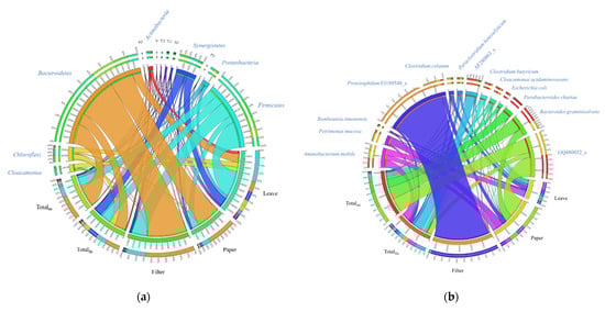 Circos representation of bacterial communities from the anaerobic digestion of intact cigarettes or individual components as: (a) phylum level; (b) species level.