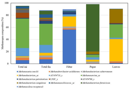 Strains of methanogens were highly dependent on the substrate (Figure 5). Hydrogenotrophic methanogen was mostly dominant; however, in filter-fed AD, Methanosaeta concilii, an acetoclastic methanogen, was dominant (Figure 5 and Table 3). Methanosaeta spp., a potential indicator for anaerobic conversion of long-chain fatty acids to methane [45], and Methanosaeta concilii have been identified as the main methanogens present in a full-scale anaerobic bioreactor treating paper mill wastewater [46]. Interestingly, Methanobacterium formicicum was highly dominant (77.72%) in paper-fed AD (Table 3). M. formicicum has been found during AD in the presence of long chain fatty acids [47] even though it can utilize the low carbon such as CO2 and formate [48] and has been described as the H2-utilizing partner of the VFAS-degrading microbiome [49]. There was no significant difference in the types of volatile fatty acids among filter, paper, leaf-fed AD (Figure S2). The reason for the dominance of M. formicicum in paper-fed AD remains unknown, but the coculture of M. formicicum with anaerobic fungi shows high production of cellulolytic and xylanolytic enzymes [50]. In this study, Methanobacterium congolense was present at 22.68% in leaf-fed AD (Table 3). Methanobacterium congolense was earlier isolated from the AD reactor of cassava peel [51] and also found in a biogas plant with low VFAS concentration (<500 ppm) [52]. It has also been used to study the conversion of low-concentration CO2 to CH4 [53]. Methanogens acting on intact cigarettes were predominantly uncultured Methanosarcina species (denoted as Methanosarcina_uc in Figure 5 and Table 3). These species are capable of using various compounds (H2/CO2, acetate, formate/methanol) as the energy source [54,55]; hence, it is difficult to determine the main substrate in intact cigarettes.