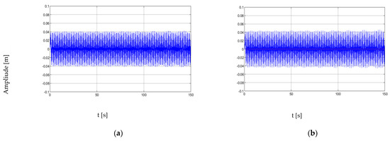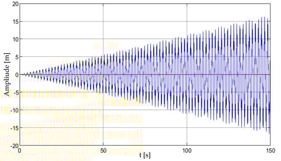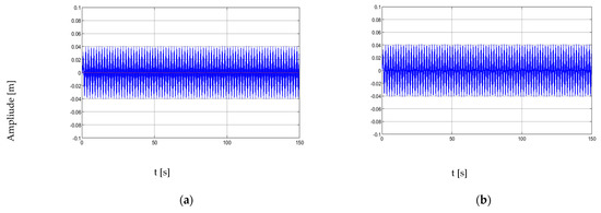 In the next step, using professional Matlab/Simulink software, calculations enabled checking the correctness of the results of active reduction of vibration in the analyzed system. The time waveform of the displacement of the first and last stories was generated, taking into account the action of the exciting force and active force on the system (see Figure 3, Figure 4 and Figure 5).