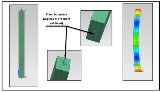 Flexible link elements were used to create yielding system for the building supporting columns. These are the elements that may deform during dynamic analysis and are converted at each iterative step of the analysis using the FEM solver (NX Nastran). For this purpose, an initial modal analysis was performed using the FEM method, determining the frequencies and modes of natural vibrations of the supporting columns. At the first step, the supporting columns were discretized with finite elements of the CHEXA type (8), then appropriate boundary conditions were introduced, and plastic parameters were assigned. In order to obtain the appropriate stiffness of the supporting columns, while defining the plastic parameters, the equivalent Young’s modulus [33] was determined in accordance with the following relationship (15):