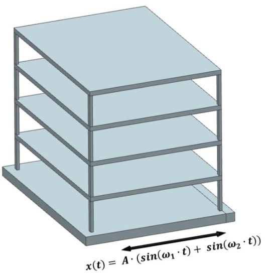In the first stage of the tests, a case (Figure 8), in which the building is affected only by a paraseismic excitation of a displacement applied to the base, with amplitude A and frequencies equal to the first and the second of the natural frequency of the system, was considered.