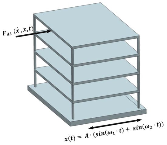 Two cases of determining the active force reducing the vibrations to the desired amplitude of the system, by modifying the dynamic characteristics describing the object together with the active force, were considered. The vibrations of the model of the tested structure were induced by a kinematic excitation simulating an earthquake equal to 5 degrees on the Richter scale. For both cases, the responses of the system for excitation by the harmonic force of frequencies equal to the first two forms of the natural vibrations of the tested system were generated. To verify the determined force reducing the vibrations of the object and to create a visualization of the analyzed phenomenon, the building structure was dynamically analyzed with the use of PLM Siemens NX 12 software [38,39,40]. The determined force parameters were implemented into a numerical model in which the tested system was modelled, and the response time waveforms were generated for each story. The generated waveforms were compared with the waveforms obtained based on the mathematical model used for determining the active force reducing vibrations.