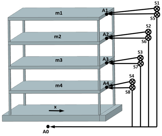 To measure the displacement and velocity of each story over time, sensors (Table 2) were introduced into the model that measure the distances and velocities between markers placed on the stories (A1–A4) and a marker placed on the base of the building A0 (Figure 11).