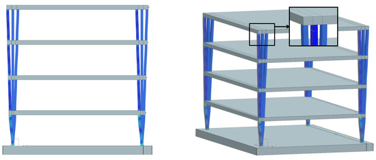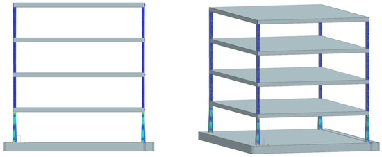 CAD/CAE software, PLM Siemens NX 12 software was used to create the virtual model of the building. Verification of the determined parameters of the forces reducing the vibrations of the object and the visualization of the analyzed phenomenon was carried out in the motion simulation module, and the “simcenter motion” solver was used for the calculations. At the first step, a 3D model of the building was created (Figure 6). Each story of the building was modelled in the form of plates of dimensions 15 m × 20 m × 0.5 m, and the load-bearing columns in the form of beams of a cross-section dimension 0.3 m × 0.5 m and a height of 3.5 m. The dimensions of the plates were selected so that the masses of the story (assuming that they will be the plates and beams made of reinforced concrete) correspond to the parameters of the analyzed system.
