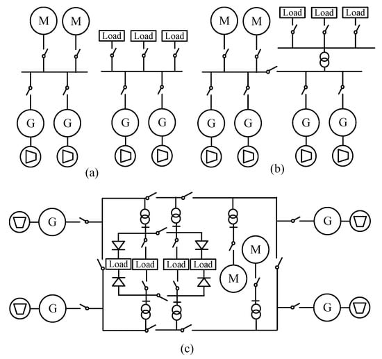 Traditional AC ship distribution systems: (a) propulsion isolated, (b) radial IPS, (c) modern AC zonal distribution system.