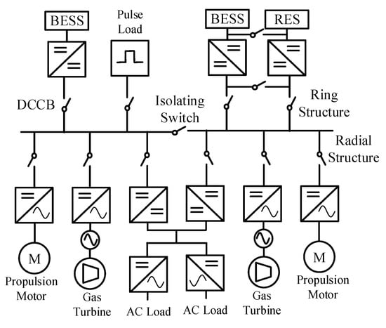 However, the industry has seen a move towards DC power systems, specifically towards MVDC [10], for IPSs, as shown in Figure 2. AC ship power systems have disadvantages, with bulky transformers taking up important space and weight [13]. Furthermore, in traditional AC systems, the excess capacity from the propulsion power system when travelling at a low speed or when the vessel is stationary cannot be directly used or stored in BESS [9]. Another reason for the move towards DC systems is that power electronic devices are becoming increasingly common in ship power systems [9]. Modern ship systems also often utilise pulse-loads, which are loads that draw a very high current in a short time and over intermittent periods [21]. However, gas-powered AC generators have a slow response, which does not match the fast response that is required for the emerging pulsed loads [33]. On the other hand, energy storage devices (DC systems) as well as power electronics provide a fast response. DC networks also avoid the issues that are associated with the synchronisation of loads to sources and reduces voltage drops and power losses due to reactive power [35]. Therefore, BESS and possible renewable sources (RES) can be connected to the IPS. In AC grids, power quality issues such as the harmonics and frequency fluctuations that are caused by pulse loads and that are loads interfaced with power electronics are a system concern that require regulation in order to avoid risks to the ship and crew [9]. DC grids do not have frequency issues; however, they do have voltage stability issues [33]. Therefore, appropriate stabilising methods must be considered for MVDC distribution systems and power quality standards for DC grids that need to be defined [36]. A generic DC ship distribution network layout is shown in Figure 2 [37,38].