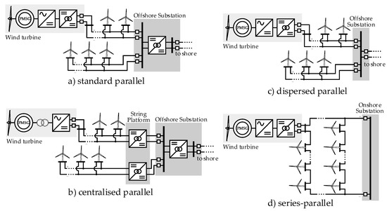 Several papers propose that the wind turbines in a DC collection grid be collected in series [63,72]. This configuration allows the wind turbines to build up the voltage to transmission levels, removing the need for an offshore converter platform. This has obvious cost benefits that are the result of halving the number of required cables and removing the offshore platform. However, since all wind turbines form a single string, any fault on the collector circuit results in the complete loss of power output [72]. The series–parallel configuration is therefore proposed by a number of papers to increase the wind farm availability [73,74]. This design consists of multiple strings of series-connected wind turbines, as shown in Figure 5d. However, both the series and series–parallel designs have several operational and technological challenges that need to be overcome in order for them to be commercially feasible. All of the wind turbines in a string must maintain the same current output, and the transmission voltage is dependent on the wind turbine power production, resulting in challenges in balancing the voltage and reductions in efficiency [75,76]. The wind turbines in each string must also be capable of withstanding transmission level voltages, which require novel wind turbine designs [72].