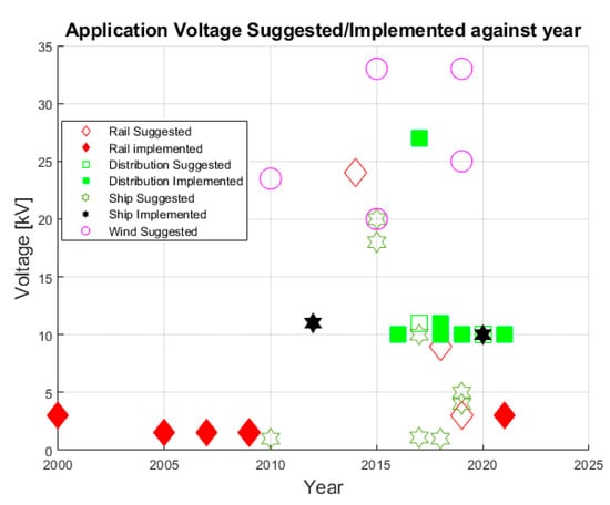 The range of the MVDC voltages that are required for various applications have not been standardised. The values that have been suggested in the literature or that have been implemented differ, with Table 1 showing these details. To further represent the variation in voltage levels, the suggested and implemented applications are displayed in Figure 6 and are represented as a function of the year. The trends show that for rail systems, the lower end of the MVDC voltages (600–1500 V) have been implemented up to the 2010s, and from 2010 to the present day, higher medium ranges (9–24 kV) are being suggested to match those of the 25 kV AC rail systems. With distribution, the most commonly suggested and implemented voltage was 10 kV, with an outlier of the ANGLE-DC project reaching 27 kV. The most commonly implemented voltage for shipboard systems was also 10 kV; however, the suggested values have a larger range due to the variety in ship sizes and in the required loads. Finally, the suggested wind offshore collection platform voltages are in the higher range of MVDC values (20 kV–35 kV).