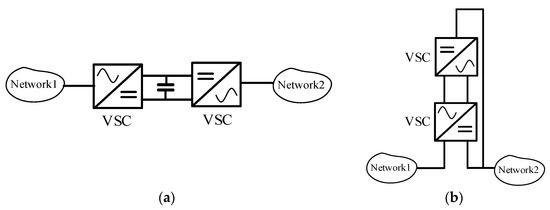 AC distribution systems often utilise a radial structure, where entire sections of the line are isolated after a fault, causing downstream supply loss [25]. It is possible to connect two adjacent independent feeders to offer electricity supply routes in case of an unplanned outage [88]. This can be achieved using standard mechanical switchgears that are also known as normally open points (NOP). As an alternative, this connection can be realised through back-to-back MVDC VSCs, which are known as soft-open points (SOP) [24,105]. An SOP has the advantage of allowing AC grids to be decoupled from each other, due to the power quality of the short circuit ratio, for example [106]. At the same time, it can provide voltage support and active power control [24,25]. SOPs can be understood as a standard back-to-back topology, as seen in Figure 7a [25]. SOPs are already being trialed; reference [92] details a 11 kV flexible power link connected to two 33 kV AC distribution networks and that has SOPs and SPBs being installed on the network [107] (Figure 7b). Following SOPs are soft-power bridges (SPBs), which perform a similar function to SOPs; however, they can process less power, reducing the number of power electronics, taking advantage of a series–parallel connection [88].