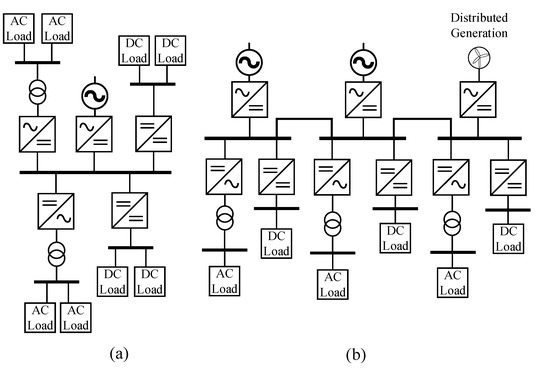 Furthermore, conventional AC systems often have radial and open-loop layouts, resulting in a lack of flexibility and controllability. This limits the implementation of distributed generation (DG), as their generated power is in a specific area, and it is not able to be supplied back upstream in times of excess power generation. Additionally, this lack of flexibility in AC shipboard system prevents excess capacity from being stored [9]. The power flow reliability is of vital importance in shipboard systems, and MVDC offers the ability to improve flexibility with integrated power systems and improved reliability [14]. The flexibility benefits of MVDC also aide rail systems, especially urban rail networks [15], by improving protection control [16], enabling flexible integration with distribution grids, and simplifying onboard energy conversions [16]. AC radial networks in distribution grids with DG could also result in over-voltages and congestion [17]; however, the ability of the distribution system to respond to uncertainty from supply and demand must be maintained [18]. DC distribution systems have more configurations, leading to improved flexibility for these applications.