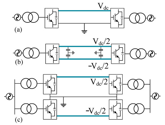 There are three main bus structures for MVDC networks [121]: unipolar asymmetric, unipolar symmetric, and the bipolar structure (see Figure 9). Unipolar symmetric systems consist of a single conductor and a ground return, and the symmetric structure uses two conductors. This symmetric structure is preferred in MVDC systems. On the other hand, bipolar buses might be able to run with two cables, but if one of the poles fails, it is possible to keep it running by considering a grounded or metallic return.