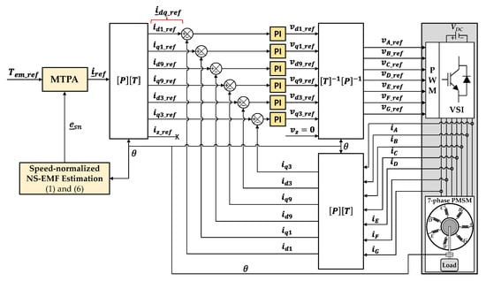 The classical RFOC scheme for torque control of a seven-phase PMSM is described in Figure 1. For a given reference torque Tem_ref, seven reference phase currents iref with minimum total copper losses can be calculated by using MTPA strategy [,] using the estimated NS-EMFs esn. These currents are transformed into d-q frames (id1_ref, iq1_ref, id9_ref, iq9_ref, id3_ref, iq3_ref, iz_ref). Current iz_ref is equal to zero due to the star connection. The electrical position θ obtained from an encoder is provided for the speed-normalized NS-EMF estimation and Park transformations.