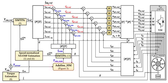 The proposed control scheme to eliminate torque ripples for healthy mode is described in Figure 2. This scheme is developed from the classical RFOC scheme in Figure 1 and SMTPA. The transformations and six PI controllers for current control are preserved. Compensating currents are added to the existing reference currents from SMTPA to adaptively eliminate torque ripples. The total torque Tem of the seven-phase machine is calculated from measured phase currents and estimated NS-EMFs according to (8).