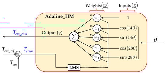 Consequently, the compensating currents to eliminate torque ripples need to be adaptively determined. In this study, an Adaline for healthy mode (“Adaline_HM”) is proposed to adaptively determine the compensating currents. Indeed, Adaline possesses advantages such as fast convergence, self-learning, and easy-to-implement [,,,,,,,,,,,,,,,,]. The specific Adaline will be presented in the next subsections.