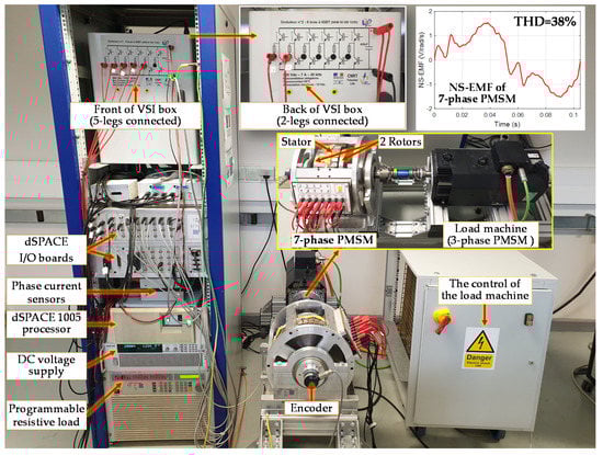Without loss of generality, the proposed control scheme is tested on a seven-phase PMSM having a high THD (38%) of NS-EMFs. The proposed control scheme can be easily applied to other electric machines with different numbers of phases and NS-EMF waveforms. This part of the study is an extension of [] with additional explanations and experimental results. A demonstration Video S1 is provided with this part of the study.