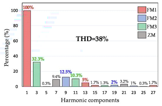 In other words, a seven-phase machine can be mathematically decomposed into three two-phase fictitious machines (FM1, FM2, FM3) and one zero-sequence machine (ZM), corresponding to reference frames (α1-β1), (α2-β2), (α3-β3), and z, respectively []. A fictitious machine with its corresponding decoupled reference frame is associated with a group of harmonics as presented in Table 1.