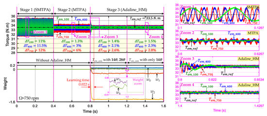 With a learning rate of 0.001, the learning time to eliminate torque ripples is about 0.022 s at 750 rpm (see stage 3 and zoom 3 in Figure 6). It is noted that absolute values of weights w3 and w4 of harmonic 28θ are very small (<0.06) compared to those of w1 (0.2), w2 (1.49), and Tave (33.5 N.m). Therefore, using only w0, w1, and w2 to eliminate harmonic 14θ still guarantees a high-quality torque. Indeed, from 1.2 s of Figure 6, the torque ripple with 3 weights at the three speeds is 0.1% or 0.2% slightly higher than the case with 5 weights (see stage 3 and zoom 4 in Figure 6).