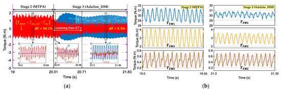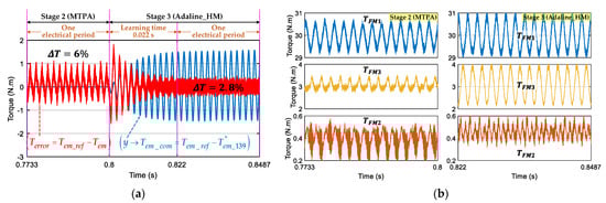 Figure 11a presents the learning process within 0.7 s at 400 rpm to eliminate Terror. It is noted that the main harmonic of torque ripples in stage 2 is T14θ due to 14 oscillations in one electrical period. When y converges to Tem_com, Terror significantly reduces, and the torque ripple decreases from 10.1% to 5.5%. Torques generated by the three fictitious machines are presented in Figure 11b. In general, TFM1 and TFM3 are opposite with similar amplitudes in both stages 2 and 3. However, ripples of these torques with the Adaline-based scheme are lower than those of MTPA, leading to the lower total ripple in stage 3.