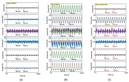 (Numerical result) Current control performance in one electrical period at 750 rpm in healthy mode using: (a) RFOC scheme with SMTPA (Stage 1); (b) RFOC scheme with MTPA (Stage 2); (c) proposed Adaline-based scheme (η = 0.001) (Stage 3).