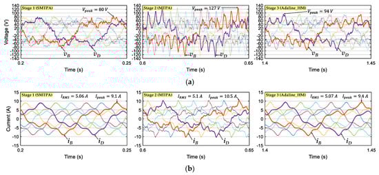 The current control performance in the three operating stages at 750 rpm is described in Figure 8. Contrary to SMTPA, MTPA generates six reference d-q currents oscillating with high amplitudes. Especially, id9 and iq9 with MTPA are no longer properly controlled at 750 rpm. Meanwhile, in the proposed Adaline-based scheme, three reference d-axis currents are null. Three q-axis reference currents oscillate with lower amplitudes compared to MTPA.