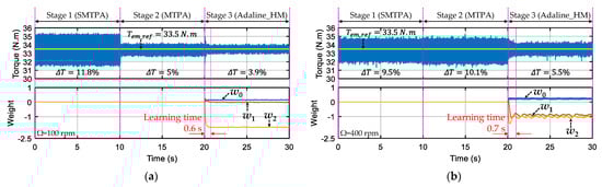 Figure 10 describes the torque performance at 100 rpm and 400 rpm. The proposed scheme in stage 3 has the best torque quality with lowest torque ripples. It is noted that torque quality with SMTPA does not change much in response to the speed increase. However, the torque ripple with MTPA almost doubles from 5% at 100 rpm to 10.1% at 400 rpm. Meanwhile, the ripple with the proposed scheme in stage 3 only increases from 3.9% to 5.5% for the same speed variation. The learning rate of 0.01 in experiments is higher than that of simulations (0.001) due to a longer sample time of calculations (350 µs in experiments compared to 3 µs in simulations). Thus, the learning time is longer within 0.6 s at 100 rpm and 0.7 s at 400 rpm as shown in Figure 10 (compared to only 0.022 s at 750 rpm in simulations in Figure 6). As discussed in the numerical result section, only three weights w0, w1, and w2 are used to eliminate torque harmonic 14θ in experiments.