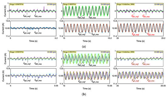 The current control performance of currents in (d1-q1) frame at 100 rpm and 400 rpm is described in Figure 12. At 100 rpm, all currents in the three stages are well controlled. At 400 rpm, with constant d1-axis currents, SMTPA in stage 1 and the proposed scheme in stage 3 have better control quality than MTPA in stage 2. It is noted that the experimental control performance of q1-axis current in stage 3 is not much better than that of stage 2. Indeed, there are current harmonics existing in d-q frames that are caused by the unwanted harmonics of NS-EMFs and the nonlinearity of VSI (e.g., dead-time voltages) as previously presented in [,,,,,,,,,,,,,,,]. However, the proposed scheme with Adaline can automatically generate a proper torque in each fictitious machine (Figure 11b) to obtain the total torque with minimum ripples as presented in Figure 10b.