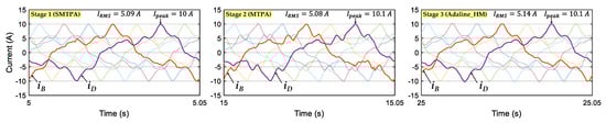 (Experimental result) Measured phase currents in healthy mode at 400 rpm with the RFOC scheme using SMTPA (Stage 1), MTPA (Stage 2), and the proposed Adaline-based control scheme with η = 0.01 (Stage 3).