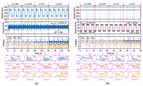 The rotating variations between 200 rpm and 300 rpm have noticeable effects on torque quality as shown in Figure 14a with torque overshoots in transient states, especially with small values of learning rate. In steady states, the torque ripple is about 4%. When the learning rate increases to 0.05, the torque overshoots are almost eliminated. The weight variations can quickly compensate the effect of the speed variation on torque. An increase in learning rate generally results in faster weight convergence, except for w0 due to weight oscillations.