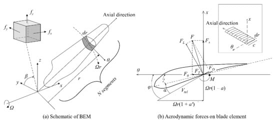 Assuming that wind turbine blade is divided into N blade elements with dr representing width or axial length of each blade element, schematic of BEM is shown in Figure 1a. Aerodynamic forces on each blade element are presented in Figure 1b. Then, aerodynamic lift (dFL), drag (dFD), axial (dFT), and momentum (dM) forces of each blade element can be, respectively, calculated using following equations: