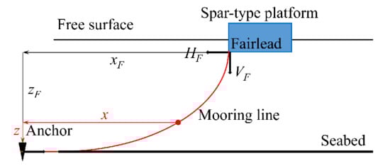 This study regards mooring lines as catenaries and utilizes a quasi-static solver to solve deformation and tension of mooring lines []. The adopted quasi-static solver can counter distributed mass, mooring stress, and mooring elastic. When one mooring line partly lies on seabed, its governing equations can be expressed as