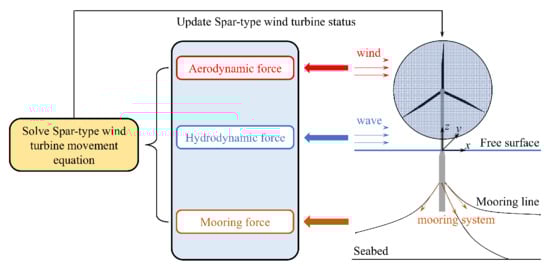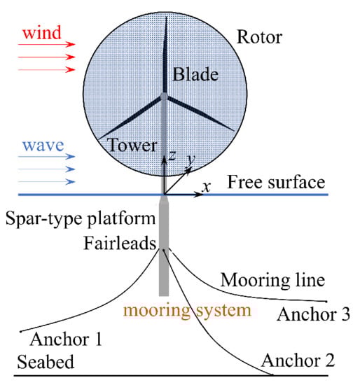 Therefore, this study reduces floating wind turbine movements through improving the Spar-type platform mooring system. Larger platform overturning and torsional stiffnesses are desired in the developed mooring system. When examining the performance of the developed mooring system, an experiment and numerical simulation can be conducted. However, an experiment can only test some typical cases because the mooring system configuration can hardly be randomly varied in experiments. As well, an actual wave maker can only generate waves within designed wave periods and height ranges. To this end, a numerical simulation is adopted. OpenFAST (developed by National Renewable Energy Laboratory) [] is employed to simulate the wind and wave interactions of the floating Spar-type wind turbine.