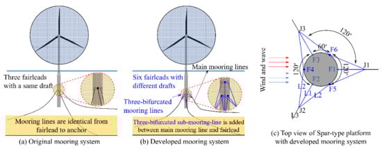 Schematics of original and developed mooring systems: (a) original mooring system; (b) developed mooring system; (c) top view of Spar-type platform with developed mooring system.