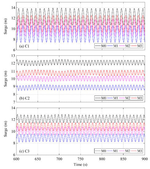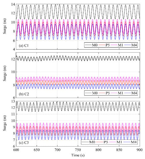 Figure 16 shows the wind turbine surge movements with different mooring systems (M0, P5, M1, and M4) when under regular waves (C1–3). From Figure 16, it can be directly observed that the wind turbine surge drifts with M0 are always larger than those with P5, M1, and M4 when under regular waves. The surge drift with M1 is slightly larger than that with P5; hence, it can be inferred that increasing the total mooring line length could be more effective in wind turbine vibration controlling compared with optimizing the connection way of mooring lines. After attaching the clump mass in M1, M4 performs better than M1, implying that attaching a clump mass in the developed three-bifurcated mooring system can further improve its resistance ability. The surge drifts with M1 and M4 are approximately 8.7 m and 7.7 m, respectively. M4 further reduces 11.5% the wind turbine surge drift compared with M1. Besides, Figure 16 indicates that the surge movement oscillation amplitudes are almost at the same level. Hence, it can be inferred that P5, M1, and M4 can effectively reduce the wind impact on the wind turbine surge movement, while the wave impact can hardly be reduced by them. This supports the conclusion drawn in Section 4.2.1 again.