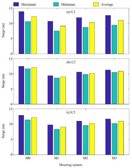 To quantitatively examine the developed mooring system performance, the maximum, minimum, and average values of the surge movement time series, as shown in Figure 6, are calculated and presented in Figure 7. It can be seen that the average values of the surge movement time series are almost at the same level as long as the mooring systems are the same, quantitatively indicating that the wind turbine surge drift is mainly resulted by the wind load, which can hardly be affected by the wave conditions. When the mooring system configuration varies, the average values of the surge movement time series change also; specifically, the average value of M0 is the largest (mean value is equal to 12.30 m in C1–3), implying the largest wind turbine surge drift occurs when applying M0. For the developed mooring systems, the largest wind turbine surge drift occurs for M3 (mean value is equal to 11.1 in C1–3). As the sub-mooring-lines decrease, the developed mooring system performs better and better. For M1, the floating wind turbine only drifts 8.87 m, which reduces by 27.88% compared with the original mooring system. From Figure 6, it can be seen that the wind turbine moves sinusoidally and regularly in the surge direction; hence, the difference between the maximum and minimum values in Figure 7 can be roughly regarded as the surge movement amplitude. From Figure 7, the surge movement amplitudes are almost at the same level so long as the wave conditions are the same, quantitatively indicating that the wind turbine surge oscillating movement is mainly resulted by the wave load, which can hardly be controlled by the developed mooring system. When the wave condition varies, the surge movement amplitude changes also; specifically, the amplitude of C1 is the largest (mean value is equal to 3.21 m in M0–3), and the amplitude of C2 is the smallest (mean value is equal to 0.7 m in M0–3). Thus, it can be said that the wind turbine surge oscillating movement amplitude is sensitive to the wave height. The larger the wave height, the higher the wave energy will be, and the larger the surge oscillating movement amplitude will be.