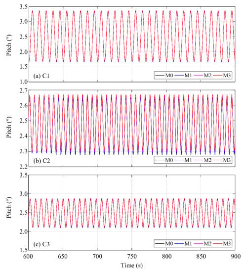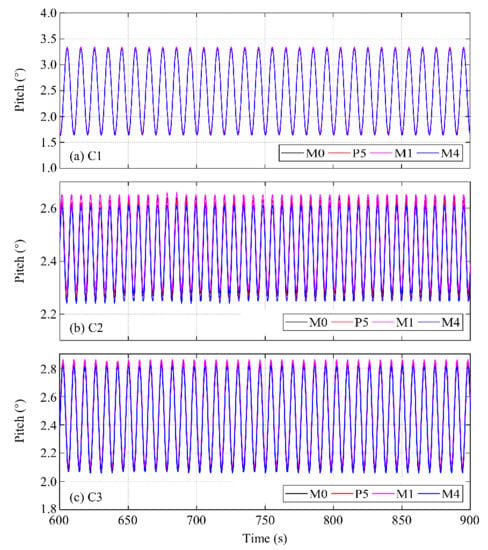 Figure 8 shows the wind turbine pitch movements with different mooring systems (M0–3) when under regular waves (C1–3). From Figure 8, it can be directly observed that the floating wind turbine moves sinusoidally in the pitch direction when under the coupling impact of wind and regular waves. Similar to the surge movement, the pitch movement can also be divided into two parts, which are the constant drift in the pitch direction, mainly resulting from the wind, and the dynamic oscillation around the equilibrium position after the pitch drift, mainly resulting from waves. Figure 8 shows that the developed mooring system can hardly control the wind turbine pitch movement, either the wind part or wave part. Even when the wave height is relatively small, the pitch drifts of the wind turbines with the developed mooring systems are slightly larger than those of the wind turbines with the original mooring system (see Figure 8b). Every time when the sub-mooring-lines are lengthened, the wind turbine pitch drift increases by approximately 0.1° when under C2. Besides, for the pitch oscillating movement mainly resulting from waves, it can be observed that it is not controlled by the developed mooring systems. Although the pitch drifts for M0–3 under C2 exhibit slight differences from each other, the pitch oscillating movements do not show an obvious difference after applying the developed mooring system. Hence, it can be said that the developed mooring system can hardly reduce the wind turbine pitch movement.